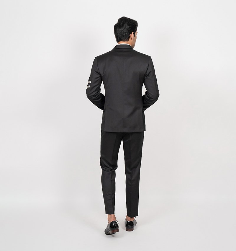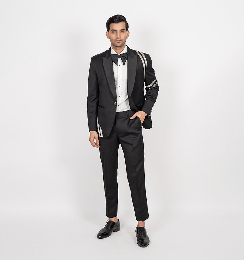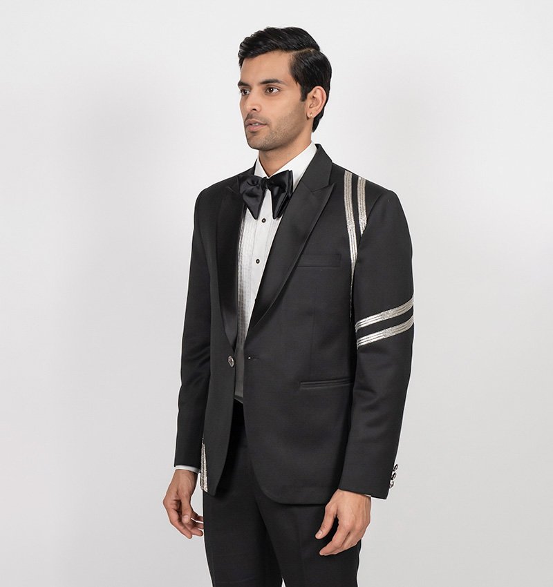 Quintessential solid black tuxedo with sequence and cutdana hand embroidery. Wear this for cocktail or engagement event to leave your mark.