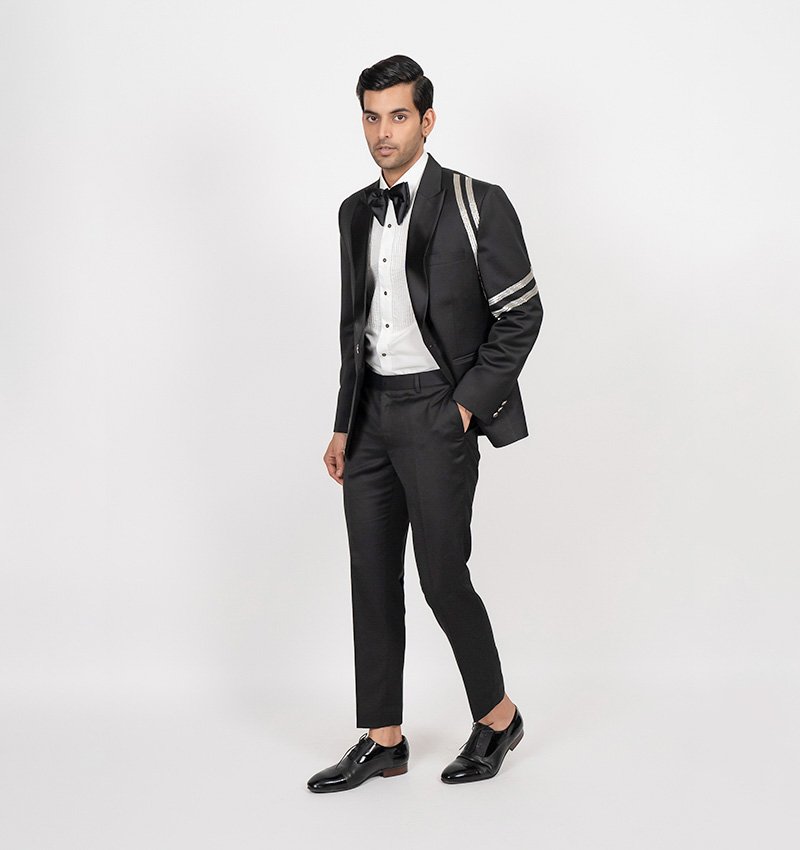 Contemporary black tuxedo, hand embellished with sequenc, all set to make you stand out from the crowd. Wear it to a cocktail or engagement event.